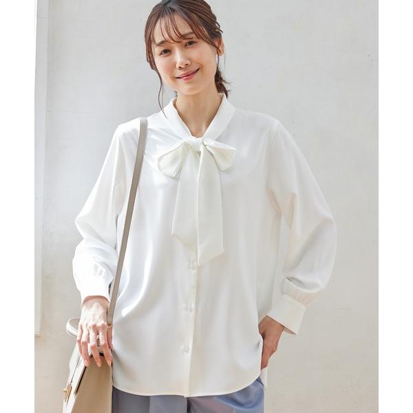 チュニック丈なので腰回りをカバーしつつも、ボウタイがアクセントになって、華やかな印象に。